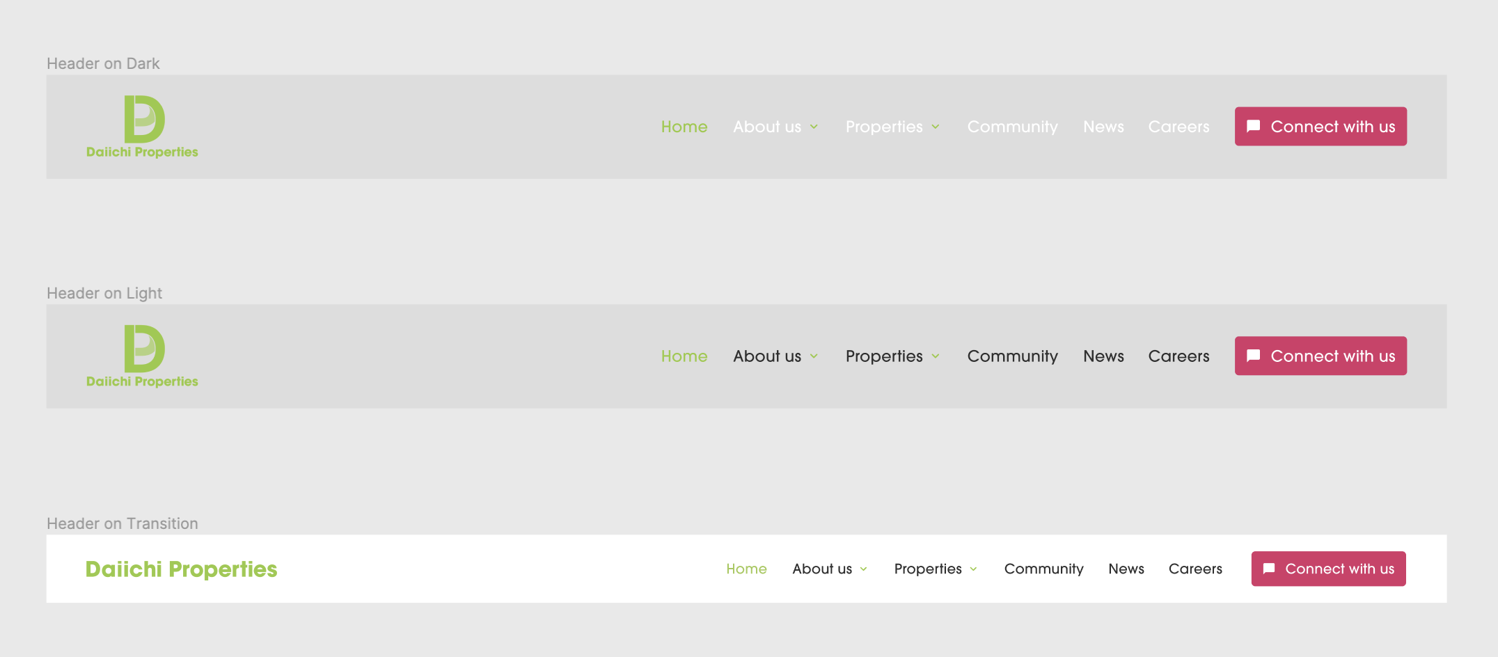 Recognizing the client's imagery-rich design, I designed a translucent header to provide a seamless transition into captivating hero sections. Considering that background images may vary in color, I implemented two types of headers and a slimmed-down, fixed header on transition.